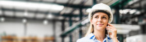 A portrait of an industrial woman engineer standing in a factory, making a phone call.