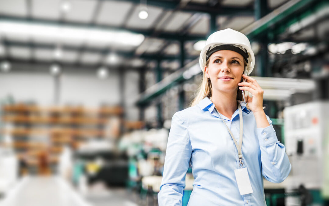 A portrait of an industrial woman engineer standing in a factory, making a phone call.