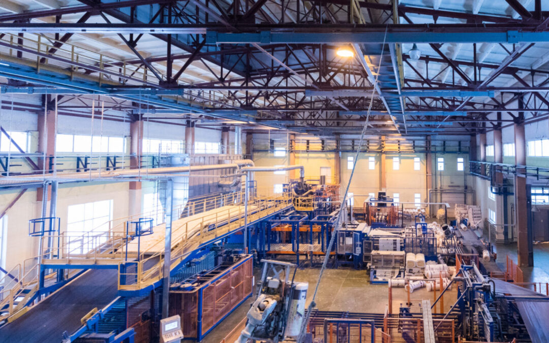 Fiberglass production industry equipment at manufacture background, wide-focus lens