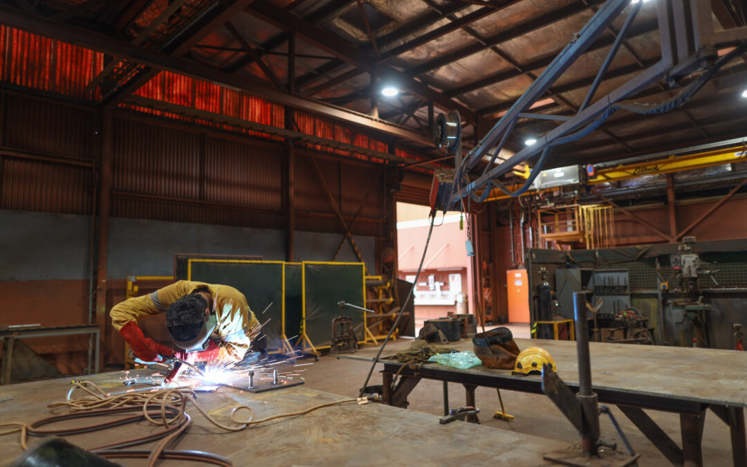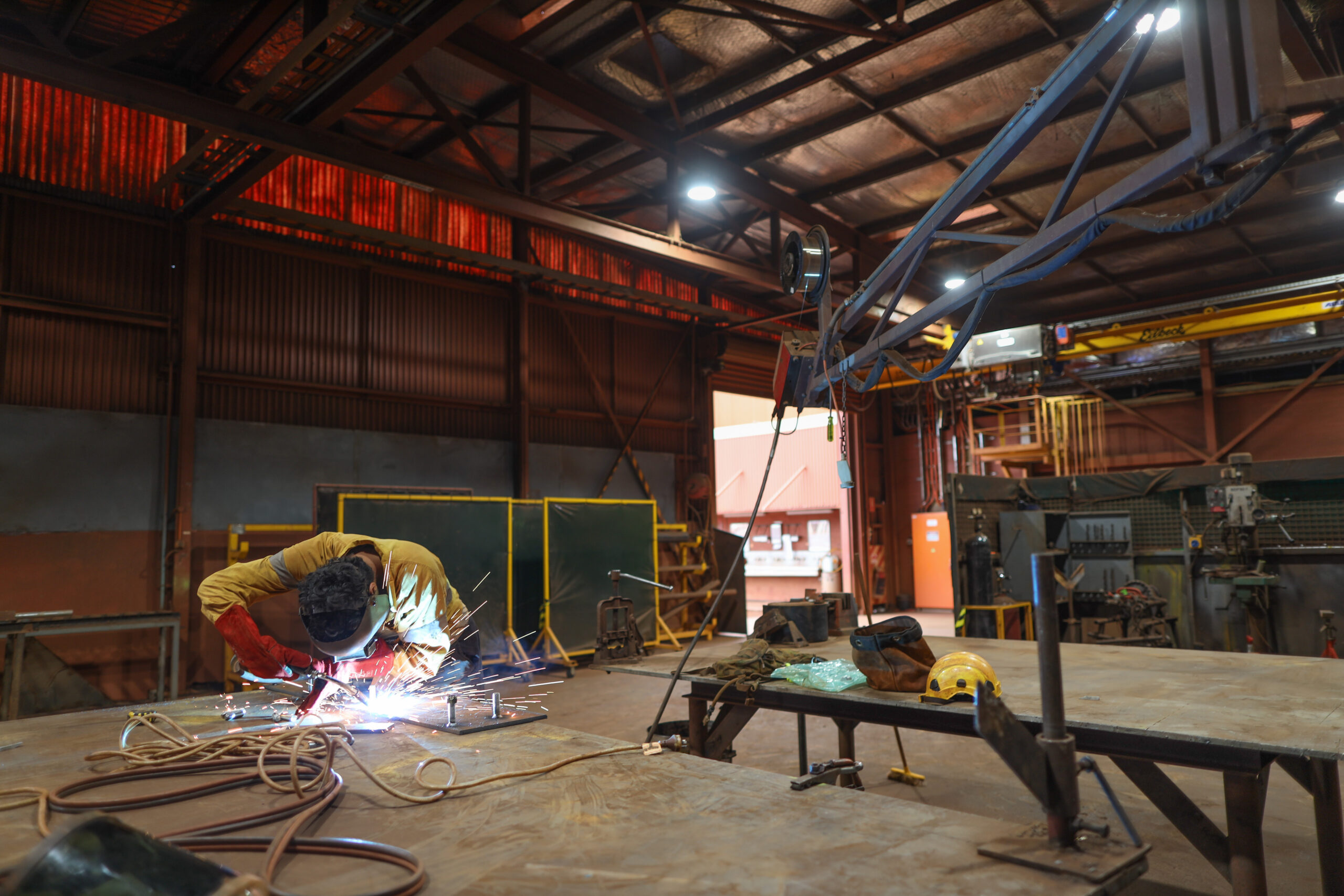 Isolated male welder wearing safety welding glove, eyes protection performing arc welding at the construction fabrication site workshop