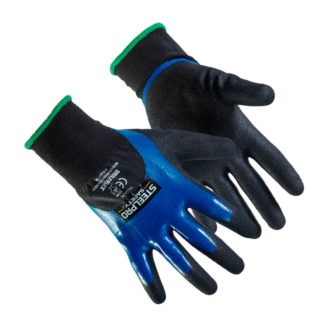 - Recubrimiento: Nitrilo arenoso (Sandy) en palma y en ocasiones hasta 3/4 del dorso, brindando excelente agarre en húmedo, aceites e hidrocarburos.